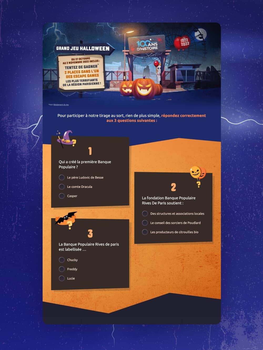 La Banque Populaire Rives de Paris nous a missionné pour la 3ème année consécutive pour réaliser un jeu concours articulé autour de l'évènement. Celui-ci consiste en une landing page comprennt un quiz avec des lots à gagner (sur tirage au sort parmi les soumissions gagnantes).