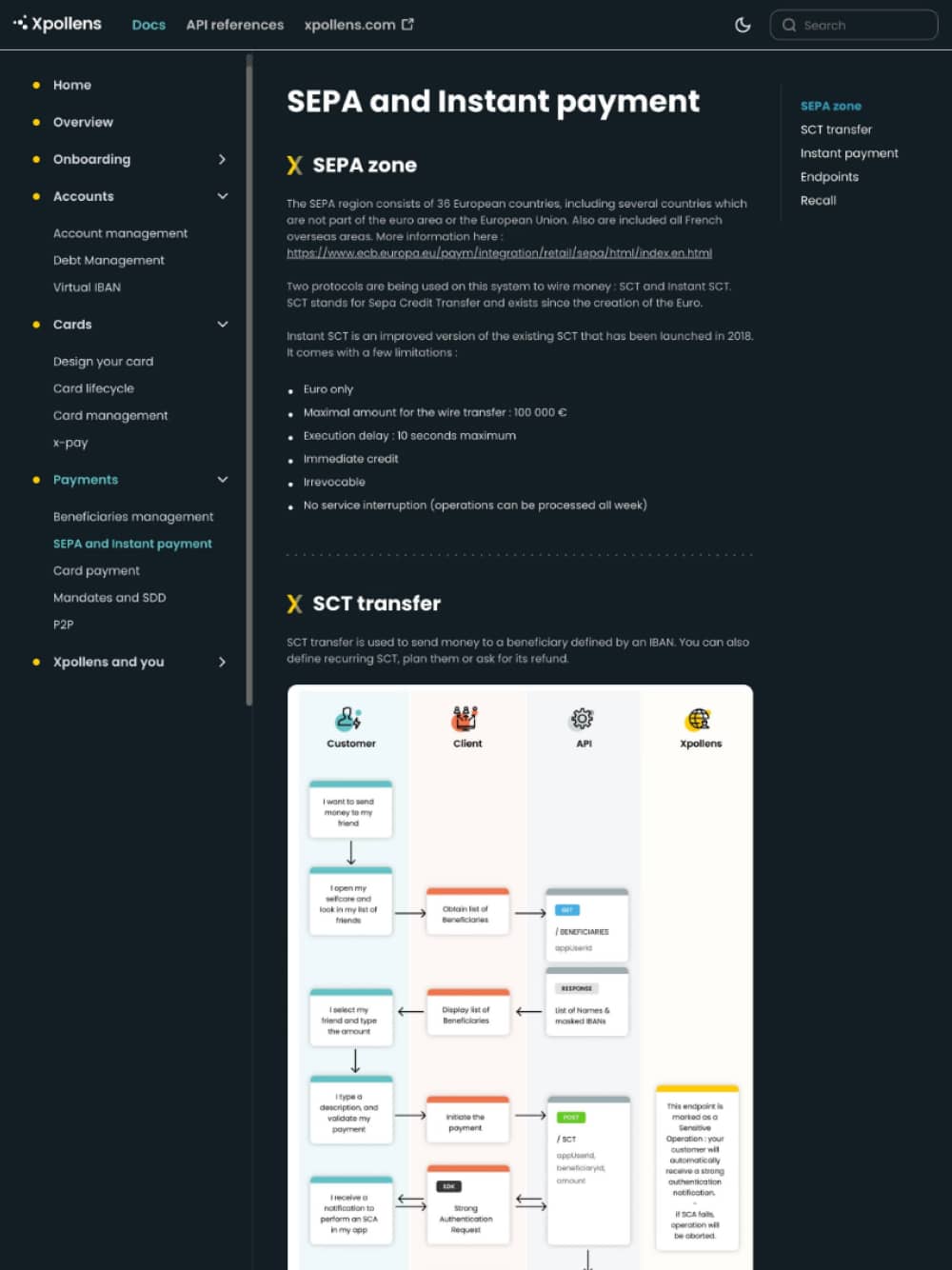 XPollens (filiale du groupe BPCE), nous a confié la réalisation de leur site de documentation des APIs Xpollens, à destination des développeurs souhaitant mettre en place une solution de paiement. Nous avons réalisé le site sur la base du framework Docusaurus (React), et administré un repo d'équipe Git comme solution de gestion de contenu (pages en Markdown).